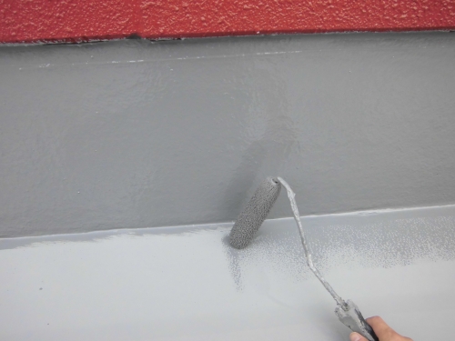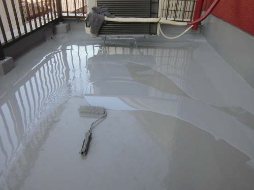 押え層からの湿気で防水に膨れが出ない様に通気緩衝シートを貼り、目止め材塗布後、防水材を一層二層と分けて流します。