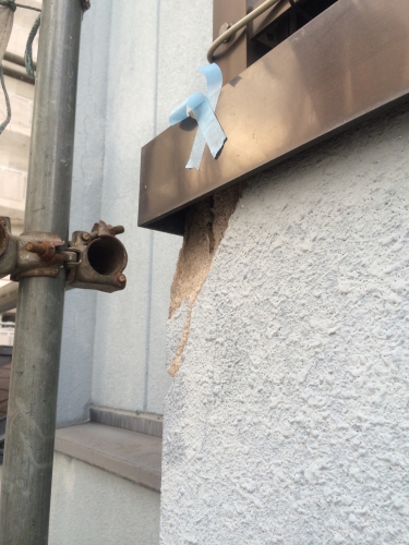 足場を組んで改めて調査すると爆裂がかなり見つかったので、まずは下地補修から始めます。