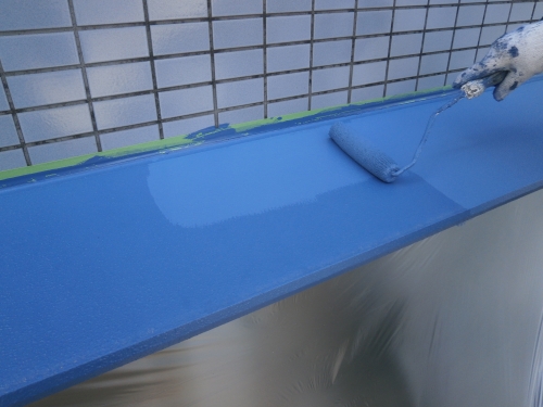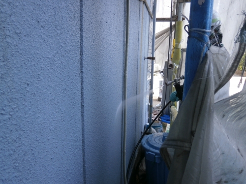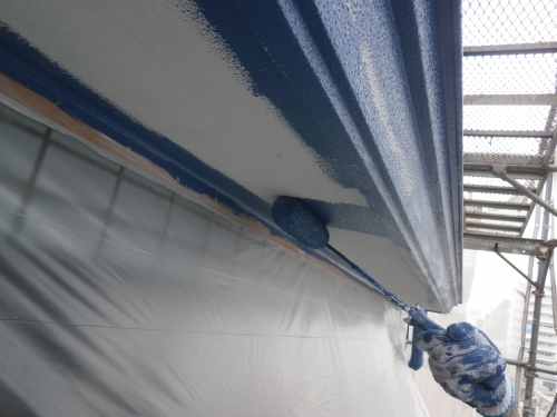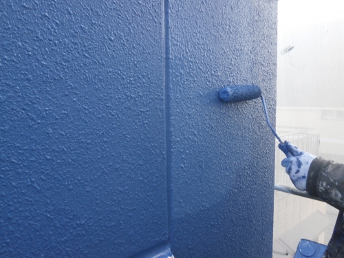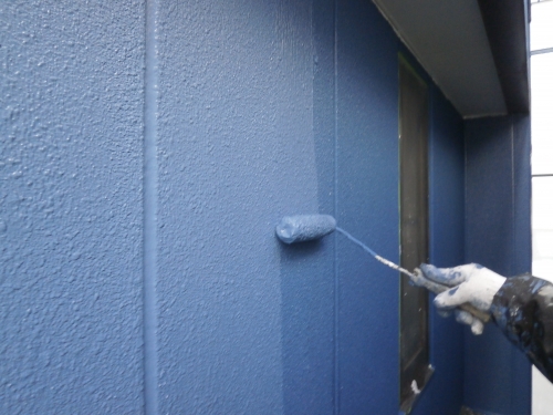 外壁の上塗りです。鮮やかな青色になりました。