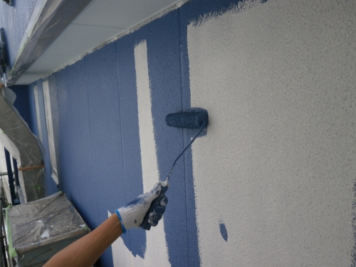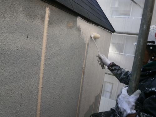 外壁の中塗りです。水性のシリコン樹脂塗料で塗っていきます。
