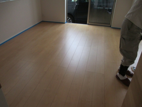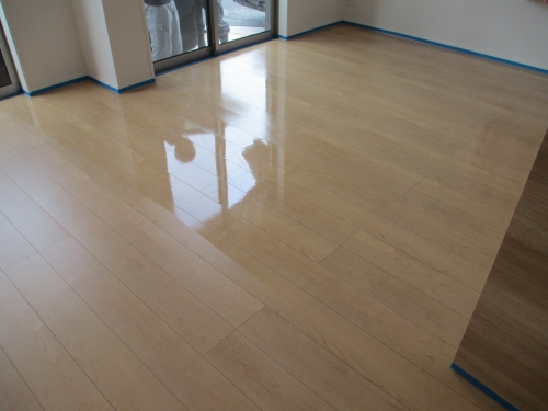 こちらは新築ですので汚れはありませんが、掃除機・シンナーなどで隅まで念入りに掃除し、巾木にはコーティング材がつかない様にテープで養生しておきます。