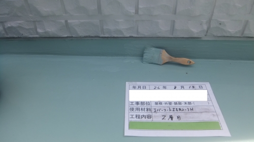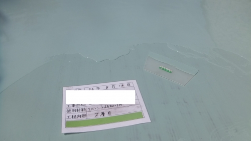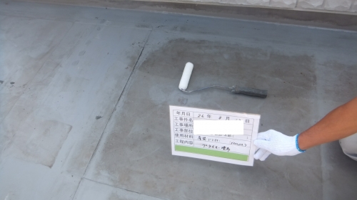 それを撤去して、塩ビシートの上からウレタン防水を施工します。まずは旧防水との密着を良くする層間プライマーを塗ります。