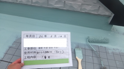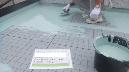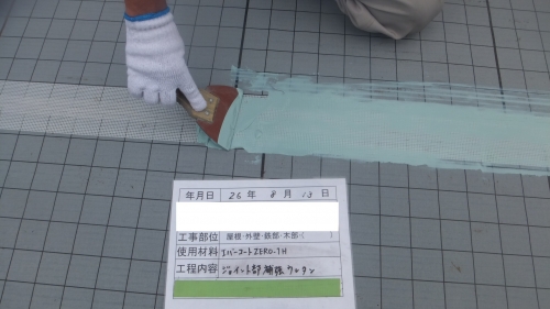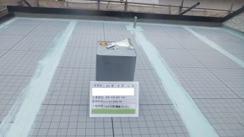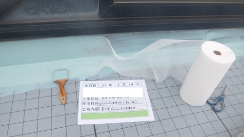 立上り部分はメッシュで補強し、ウレタン防水の1層目を塗ります。平場も同じく1層目を流します。